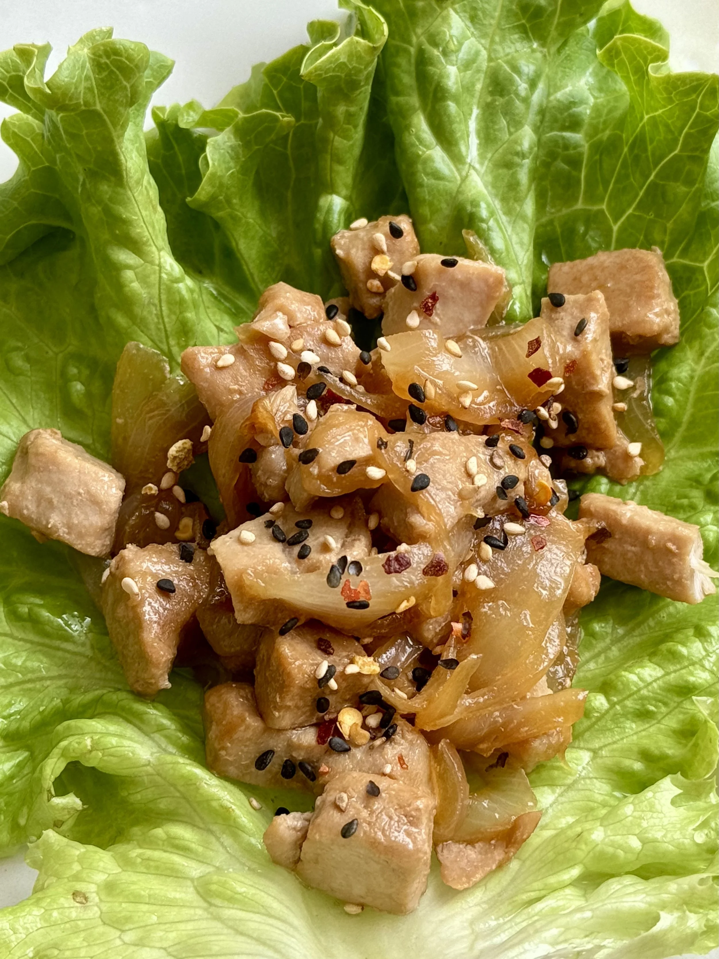 Cut the tuna in small cubes and add to the pan. Add the sake, tamari, mirin, vinegar. Let it cook (aprox. 5 minutes) in low heat.
